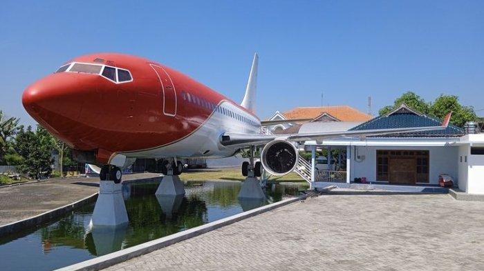Pesawat yang dipajang tersebut menyerupai pesawat kepresidenan RI dengan kombinasi warna merah-putih yang terparkir persis di depan rumah.
